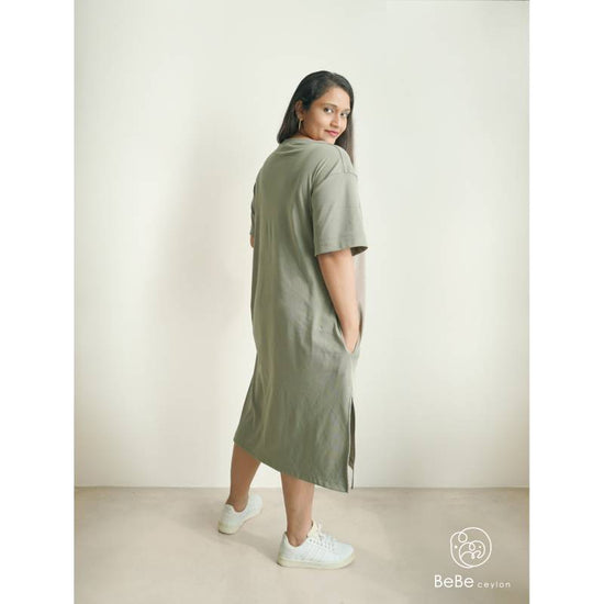 This relaxed Modana moms long dress style structured oversized loose fitted modern dress with pockets. You’ll love the smooth textured knit surface and chic Mama print. Add in a flattering deep V, and it’s made for standing out and easily walk.