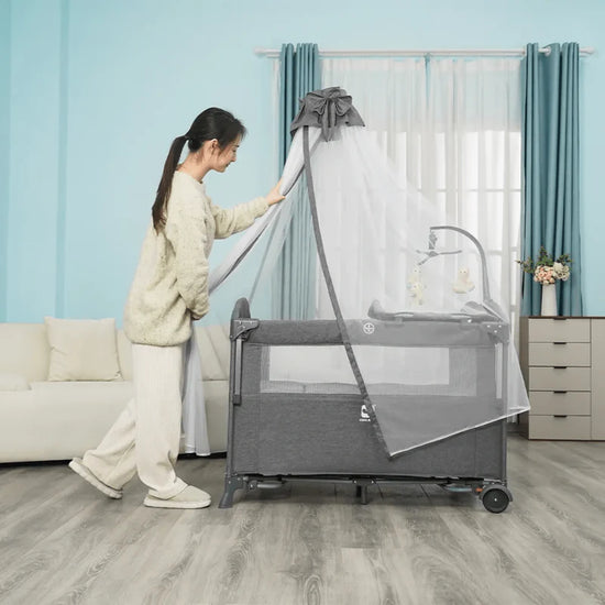 - Easily converts into a bedside sleeper, diaper changing table, baby rock cradle, activity center, and crib to adapt to your baby’s needs as they grow.
