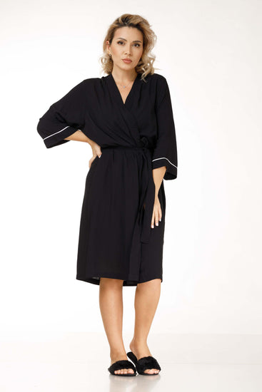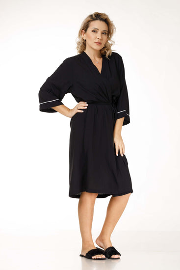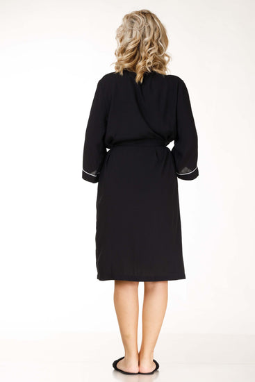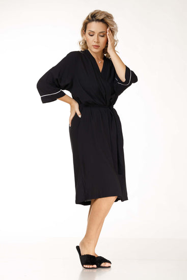 Made from high-quality cotton, the robe offers a sumptuously soft and breathable feel against your skin. The rich black hue exudes sophistication, creating a timeless aesthetic that effortlessly complements any evening or morning routine.