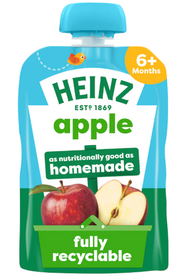The Heinz "Simple 'n' Juicy" apple product is a smooth fruit puree (baby food) made from 100% natural apple with added Vitamin C. It is designed for babies aged 6 months and older as part of a varied weaning diet.